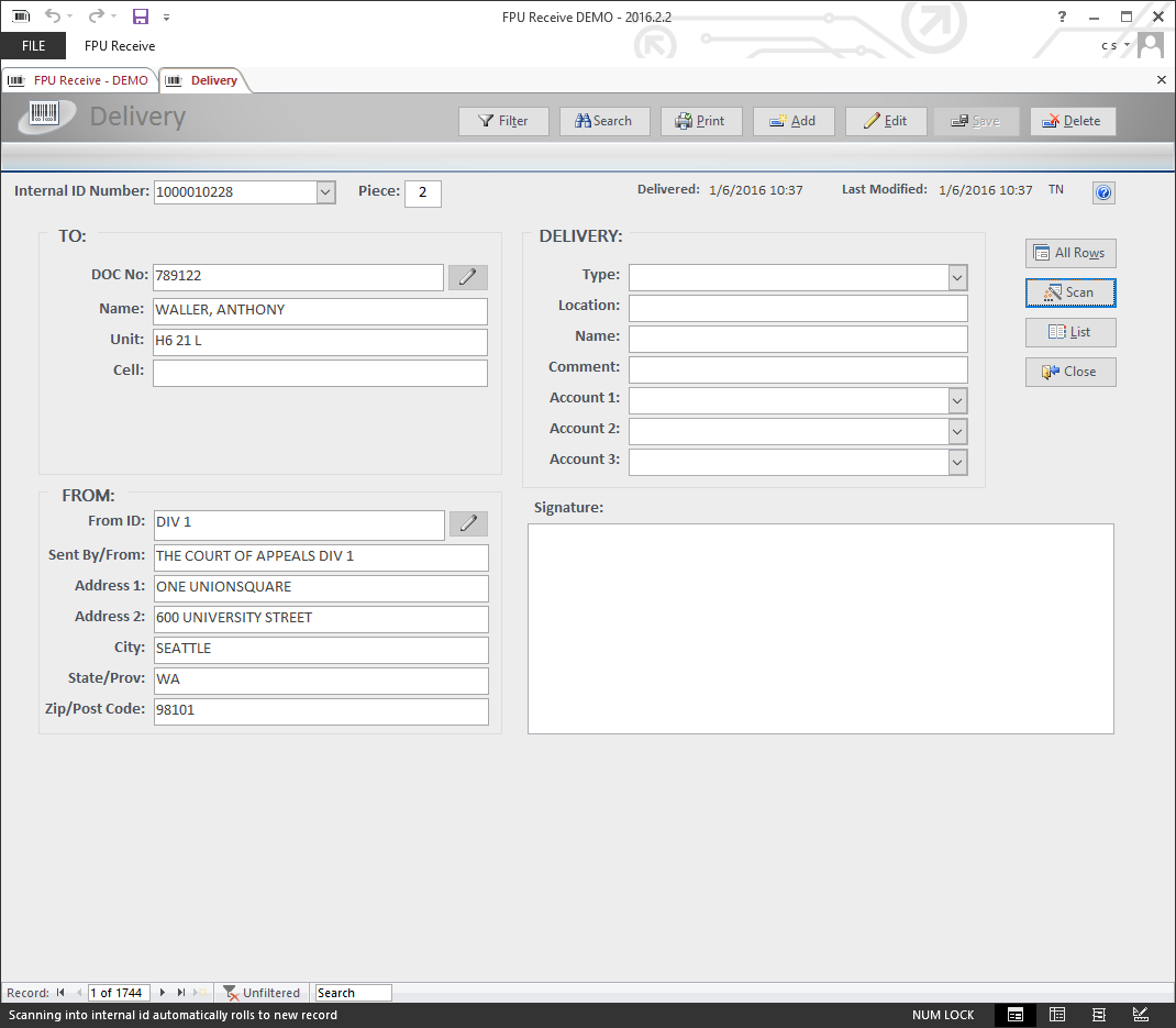 Scan – two state button “Scan” the input is done by a user. “Scanning” the input is done by a barcode scanner and the form automatically saves and adds a new blank delivery entry.