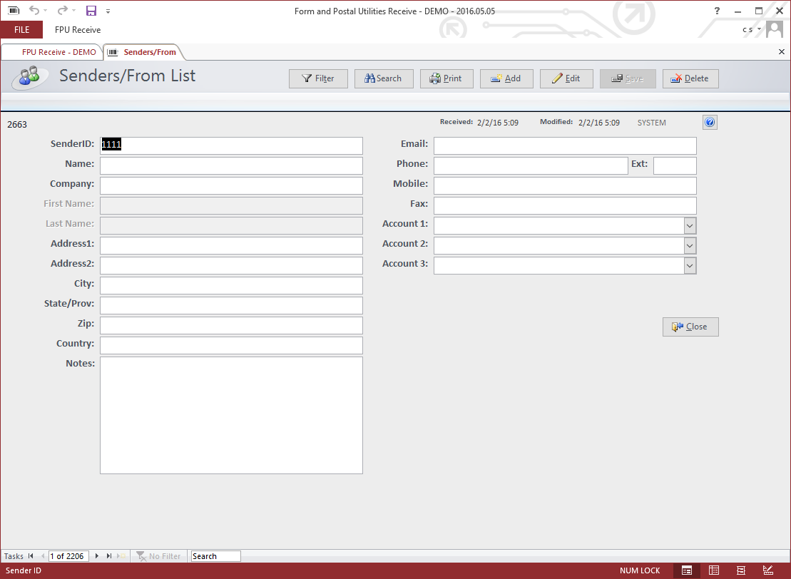 Sender ID – sender id, name and address. If not found auto popup form to save sender details, zip code auto fills city/state.